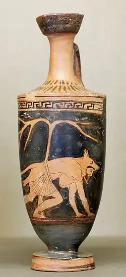 By chance, he was spotted by Odysseus and Diomedes while they were on a secret raid to plunder the Trojans. The Greek warriors saw Dolon coming and hid in the bodies of the dead so that Dolon could not see them. Diomedes chased Dolon down with guidance from Athena. Dolon, after torture, begged for his life, telling the two warriors that he was worth a valuable ransom as his father, Eumedes, was very wealthy. Odysseus said that he would not kill Dolon if he told the two of them why he was spying on the Greeks. Dolon told Odysseus everything he needed to know, including his potential prize, before Odysseus explained to him that he had been tricked by Hector; only Achilles had the ability to control the horses that he was to receive. Dolon then informed the two Greeks which Trojan allies were living in which tent and what their strengths were. After this, Odysseus went back on his promise and Dolon was decapitated by Diomedes before the two went into the Trojan camp to wreak havoc, slaying Rhesus, king of Thrace, and stealing his valuable horses.[2] His son Eumedes, named after Dolon's father, survived the Trojan War to later fight and die by the hand of Turnus under the command of Aeneas in Italy.[3]