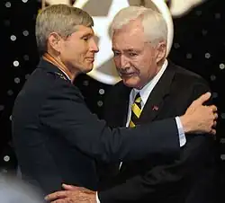Overton (right) is embraced by Air Force Chief of Staff General Norton Schwartz after being presented with the Distinguished Service Cross in September 2009.