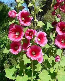Malvaceae (/mælˈveɪsiˌaɪ, -siːˌiː/), or the mallows, is a family of flowering plants estimated to contain 244 genera with 4225 known species.[4][5] Well-known members of economic importance include cacao, cola, cotton, okra, roselle and durian. There are also some genera containing familiar ornamentals, such as Alcea (hollyhock), Malva (mallow), and Tilia (lime or linden tree). The genera with the largest numbers of species include Hibiscus (434 species),[6] Pavonia (291 species),[7] Sida (275 species),[8] Ayenia (216 species),[9] Dombeya (197 species),[10] and Sterculia (181 species).[11][12]