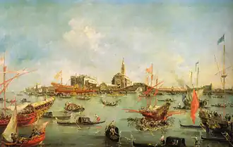 After the funeral, a large crowd assembled in their gondolas and armed galleys.[9] Domenico Tino says "an innumerable multitude of people, virtually all Venice" was there to voice their opinion on the selection of a new Doge.[15] After the bishop of Venice asked "who would be worthy of his nation," the crowds chanted, "Domenicum Silvium volumus et laudamus" (We want Domenico Selvo and we praise him).[16] The people, according to the account, had clearly spoken, and with these cries, the election was over. A group of more distinguished citizens then lifted the Doge-elect above the roaring crowd, and he was transported as such back to the city.[15][17] Barefoot, in accordance with tradition, Selvo was led into St Mark's Basilica where, amidst the construction materials and scaffolding, he prayed to God, received his staff of office, heard the oaths of fidelity from his subjects, and was legally sworn in as the 31st Doge of Venice.[14][18]