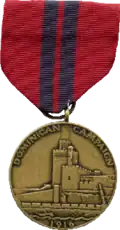 The Dominican Campaign Medal is a military decoration of the United States Navy and United States Marine Corps which was created on December 29, 1921. To be awarded the Dominican Campaign Medal, a servicemen must have performed active military duty in the Dominican Republic between May 5 and December 4, 1916.[1]