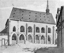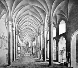 The old church was a three-aisled early Gothic hall without a transept, measuring 53.60 meters long and 15.60 meters wide.[10] It was built mainly from rubble stone, with parts of ashlar also present. The nave was eight bays long; the westernmost bay featured an ornate stellar vault, while the remaining bays had simple rib vaults. The vaults of the southern and slightly narrower north aisles of the nave were about one to two meters lower than the 11.60 meter central aisle. The vaults were supported by seven pairs of simple circular pillars featuring base plates and unadorned, cup-shaped capitals. Above the eastern pair of pillars of the nave was an octagonal Gothic flèche.