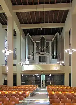 During the bombing of 18 March 1944, the nave and several of the side aisle bays were destroyed and the inside of the church was burned. The chancel arch, a large portion of the pillars and several vaults of the nave initially survived, but these collapsed in 1954 before the start of rebuilding.[11] Of the original church today only the outer walls of the nave choir, consisting of a bay with ribbed vaults, a five-eighths polygonal apse and the tracery of three of the five stained glass windows have been preserved. Of the monastery, the former sacristy (which now serves as a refectory) and the chapter house were preserved to an extent that their remains could be integrated into the new structure.