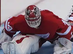 Before the start of the next season, Hašek was traded to the Detroit Red Wings on June 30, 2001, in an attempt to lower the Sabres' payroll and to send Hašek to a more competitive team.[1] He was dealt for Vyacheslav Kozlov, a first-round selection in the 2002 NHL Entry Draft and future considerations, which eventually became the draft pick of Jim Slater. During his first season with Detroit, Hašek posted a career-high 41 wins with just 15 losses,[51] helping the Red Wings earn the President's Trophy with the league's best record. In the playoffs, he led the Wings past the Vancouver Canucks, the St. Louis Blues, the Colorado Avalanche and eventually the Carolina Hurricanes in the finals to win the Stanley Cup. During the Conference Finals against Colorado, he became the first goaltender to be awarded an assist on an overtime game-winning goal in the post-season after passing the puck to Wings captain Steve Yzerman, who then assisted Fredrik Olausson in scoring the final goal of the third game of that series.[52] He also set a record for most shutouts in a post-season with six,[16] broken the year after by Martin Brodeur with seven.[53]