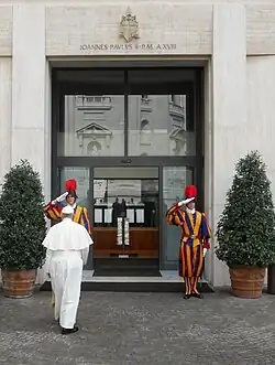 During World War II the building was used by refugees, Jews, and ambassadors from countries that had severed diplomatic relations with Italy.[12] At the end of the war, Pope Pius XII greeted 800 Roman children who breakfasted at St. Martha Hospice after receiving their First Communion.[13] It served as a home where senior clerics could live their last years.[14] Increasingly it served as a residence for clerics assigned to Vatican offices.[12][1]