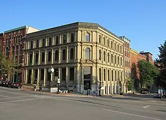 The Domville Building was built in 1878.[1] Named after Canadian Parliament member James Domville, it was one of Saint John's first major commercial buildings following the Great Fire in 1877.[2] On August 5, 1878, the cornerstone for the Domville Building was laid and presented to Domville himself.[3] It was set to be occupied by the Maritime Bank and the Bank of Montreal,[4] but it would also be used as offices for the Canadian Pacific Railway, an insurance office, and as a bar and restaurant.[5] The building has also been used to host political meetings.[6] On March 18, 1982, the Domville Building was recognized as a historic building under New Brunswick's Municipal Heritage Preservation Act, with architecture featuring a Second Empire style built using sandstone.[1] The building continues to be used by the Bank of Montreal as one of its branches.[7]