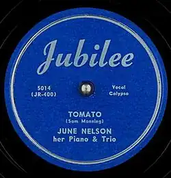 The song seems to have first been recorded (as "Tomato") in New York in 1949, by singer June Nelson, with her piano and trio, and with Manning credited as the writer. The recording was listed as a calypso, and was released by Herb Abramson's Jubilee Records, catalogue number 5014.[1][2] The song was then recorded in 1952 in London, by American singer Marie Bryant, accompanied by the Mike McKenzie Quintet featuring saxophonist Bertie King. McKenzie was from British Guiana (now Guyana), and King was from Jamaica. The record was produced by Denis Preston.[3] First released on the Lyragon label – an offshoot of Polygon Records – Bryant's recording was soon issued in Jamaica by Ken Khouri on his Kalypso label, and in the United States (as "Don't You Touch Me Tomato") by Monogram Records.[4][5]