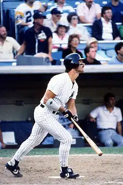 Mattingly became the Yankees' full-time first baseman in 1984.[17] With a batting average of .339, he was selected as a reserve for the 1984 All-Star Game.[17] Heading into the final game of the season, Mattingly and teammate Dave Winfield were competing for the American League batting title, with Mattingly trailing Winfield by .002. On the final day of the season, Mattingly went 4-for-5, while Winfield batted 1-for-4. Mattingly won the batting title with a .343 average, while Winfield finished second with a .340 average.[2] Mattingly also led the league with 207 hits. He hit a league-leading 44 doubles to go with 23 home runs. He was second in the league in slugging percentage (.537) and at-bats per strikeout (18.3), fourth in total bases (324), fifth in RBIs (110), sixth in sacrifice flies (9), and 10th in on-base percentage (.381).[18]