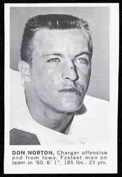 Donald Farris Norton (March 3, 1938 – June 23, 1997) was an American professional football end in the American Football League (AFL). He played college football at the University of Iowa and was drafted by the newly formed AFL in 1960, playing seven seasons for the Los Angeles/San Diego Chargers (1960–1966), making the AFL All-Star team in 1961 and 1962. After retiring, Norton began to experience health problems from steroid use, which was widespread in the teams he played on. He suffered a heart attack at the age of 59 and died in 1997 after undergoing open heart surgery.[3]