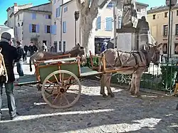 Historically, the donkey was utilized for agricultural purposes, particularly in the transportation of heavy loads such as milk cans in Normandy and young lambs in Provence.[20] In the southern Alps and Haute-Loire, donkeys were bred for export to other French regions or Italy.[21] Families that utilized the donkey's labor often developed a close relationship with the animal, as the donkey represented an exception to the traditional spatial separation between humans and animals in Provence.[22] It was not uncommon for the stable housing of the donkey to be situated on the ground floor of the domicile, near the wood and food supplies.[22]