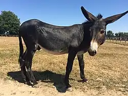 France has a diverse donkey population, comprising seven officially recognized breeds.[84][85] Each breed is the subject of an association dedicated to its preservation and promotion.[86] As of 2019, selection is primarily focused on maintaining breed standards and work aptitude, particularly for tourism and working with children.[60] Historically, French donkey breeds did not all have the same selection goal. The Poitou donkey is associated with mule production, while the Grand Noir du Berry was selected for field, vineyard, and barge traction.[35]