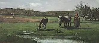 In the field of dream interpretation, the inhabitants of the Vosges region of France once believed that dreaming of a donkey portended mental sorrow and misfortune.[92] Throughout the 19th century, donkeys were associated with the hardworking populace or innocent children, as well as humility and virtue. This is evident in the works of Achille Lemot, published by Le Pèlerin, and Émile Souvestre.[93]