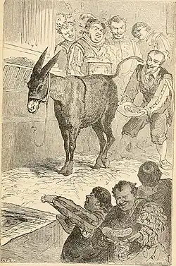 The donkey is a prominent figure in French folklore, often depicted in opposition to the horse.[131] According to a Breton dualistic popular tale, God created the horse, while the Devil created the donkey.[132][117] In Rouergue, a tale compares the horse and the donkey, with the former deriding the latter for its inferiority.[133] This confrontation between horse and donkey is also evident in La Fontaine's 1668 fable Le Mulet se vantant de sa généalogie,[131] as well as in Barthélemy Imbert's 1773 fables, where the horse represents the aristocracy and the donkey the working class.[134]