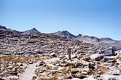 Donohue Pass is a high mountain pass on the boundary between Yosemite National Park and the Ansel Adams Wilderness. Its elevation is 11,066 feet (3,373 m).[1] It is situated between Mount Lyell and Donohue Peak. The John Muir Trail and the Pacific Crest Trail both transverse the pass. Following the John Muir Trail, the pass is 6.3 miles (10.1 km) from Thousand Island Lake, and 12.8 miles (20.6 km) from Tuolumne Meadows.[2] Donohue Pass is the sixth highest pass of the ten named passes on the John Muir Trail.