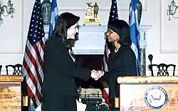 During her incumbency, she promoted the cooperation in the Balkans, where Greek companies are heavily investing, traveled through the Middle East to help outline solutions to problems and attended meetings of the Organization for Security and Co-operation in Europe to discuss developments in the region.[8] She also promoted the ratification of the Treaty of Lisbon by the Hellenic Parliament and supported Nicolas Sarkozy's plan about the Union for the Mediterranean, but did not reach a conciliation with Turkey and the Republic of Macedonia over the Cyprus dispute and the Macedonia naming dispute respectively.[10]
