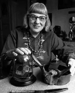 Hutton characterised Valiente as "a handsome woman of striking, dark-haired, aquiline looks, possessed of a strong, enquiring, candid, and independent personality, and a gift for poetry and ritual".[38] Belham-Payne noted that Valiente was "very tall, rather reserved and preferred to be in the background",[137] while Doreen Valiente Foundation Trustee, Ashley Mortimer described her as "sensible, practical, decent, honest and, perhaps most importantly, pragmatic".[138] The writer Leo Ruickbie described her as "a plain, owlishly bespectacled woman with a slight stoop and a friendly twinkle in her eye".[139] Throughout her life, Valiente remained a believer in the Murrayite Witch-Cult theory despite its having been academically discredited by the 1970s.[140]