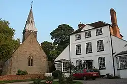 Today's farmhouse at Backberry Hill Farm, 400 yards (370 m) south-east from the church, is listed as Prospect Farmhouse, a timber-framed house, of part one storey and part two, with attics, and an external stair to the loft, dating to the early 16th century with later additions up to the 18th. North-east and adjacent to the farmhouse is a late 18th or early 19th-century "barn with attached stables and cart-shed".[31][32][33]