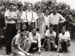 (L-R standing) P.M. Dalwadi, Maharajji (with cap), Vikas Satwalekar, Armin Hofmann, Dorothea Hofmann, Manu Gajjar, and Arjun Gajjar. (L-R seated) I.S. Mathur, S.Balaram, Ishu Patel, Rohit Modi, and Mahendra C. Patel