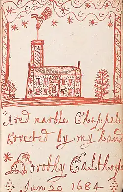 The title page also contains a drawing of a chapel in red ink and the following inscription: "A red marble Chappel Errected by my hand Dorothy Calthorpe Jun 20 1684". Making her book not only a personal space in which to record her own narratives and poems but also a chapel in which she displayed her spiritual devotion through writing.[3]