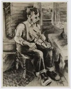 In 1932 the Morton Gallery mounted her first solo exhibition. In it, she showed paintings depicting life in the mountains of the Carolinas.[19] Critics responded favorably to the show. A review in the New York Post said she had technical facility and showed her subjects freshly and spontaneously.[20] Writing in the New York Sun, a critic wrote that the paintings were social documents that revealed life in the southern mountains in a way that was "vastly entertaining."[21] A critic for the New York Times noticed that Eisner showed more interest in the people she encountered than in the scenic environment in which they passed their lives and concluded that "she caught something of the characteristic bearing of the Southern mountaineer."[22] Her depiction of a fiddler drew attention in both the Sun and the Times. Late in life, a contemporary of Eisner's, Joseph Solman, said of the social realist style of the time: "We were all seeking the flat, and the exaggerated, and the expressionist in our own romantic, different ways."[23]