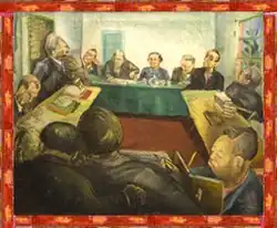 In the late 1930s Eisner exhibited as a member of a popular front organization called the American Artists' Congress.[26] After the Soviet invasion of Finland in 1940 she and a small group of like-minded artists quit the Congress to found an avowedly non-political organization called the Federation of Modern Painters and Sculptors.[27][28][note 4] In 1937 Eisner and her husband traveled to Mexico to help the Dewey Commission investigate charges leveled against Leon Trotsky by the Soviet government in the Moscow Trials of 1936–1937. Eisner made a painting of commission members interviewing Trotsky in a house on the outskirts of Mexico City owned by Rivera and Frida Kahlo. The painting (shown at left) contains a view of Diego Rivera who is making a sketch of the scene.[30] She also made two portraits of Trotsky. The two of them joked about a time when she scraped off pigment in painting his face. He made an affectionate, albeit macabre joke that she was beheading him.[5] This painting is shown in the photo of Trotsky and Eisner at top right.