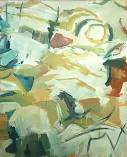 Eisner's style changed little during the 1930s and war years. During the post-war period, while most of her work remained realist, she began to study under Jack Tworkov. Although much abstract expressionist painting was then anti-figurative, Tworkov, like his friend Willem de Kooning, believed that even so-called pure abstraction made, as he said, "analogy to the figure." His obituary in the New York Times quoted him as saying "Every painter has a subject whether or not there are objects in his paintings."[43] Eisner responded sympathetically to this approach. Later she was quoted as saying, "Abstract Expressionism made me think differently. I learned from it a language of shapes and color that I was not conscious of when I was young."[31] During this period she produced much work in regular visits to the American mountain states, particularly Livingston, Montana, and nearby Yellowstone National Park. Her painting "Yellowstone River" (seen at right) shows the influence of Tworkov's instruction. While it might be taken as a pure abstraction, the title shows it to be an abstract representation of a real place.