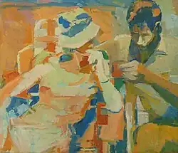 In 1960, when Eisner and her husband began spending summers on Great Cranberry Island, her work showed a new figurative style. She often showed people relaxing and engaging in vacation-time pursuits: playing cards or croquet. Just as often her subjects would be inanimate: desks, chairs, windows, a towel rack. Writing in 2008 concerning a retrospective exhibition that showed these paintings, a critic said, "her subject matter is so seemingly mundane that the viewer is startled by her choice."[1] Although abstract, her style was firmly grounded in specific places at specific times, and its realist subjects were clearly evident. She made expressionistic use of bold colors, as she had in her 1950s abstractions, but in a style that critics saw as fluid, masterfully composed, and expressionistic.[1][2] A critic said the paintings she made on Cranberry Island were orderly, distinct, and painted with great spirit.[44]
