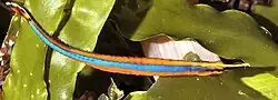The species is distinguished by its bluish mid-lateral stripe contrasting an orange or reddish body.[3] Furthermore, it has a fan-like tail.[3] A caudal fin is present,[3] which is rounded with a white outline, the inside mostly black.[7] The fish's snout is elongated.
