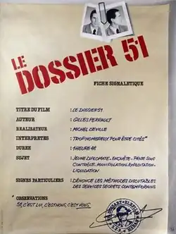 Dossier 51 (French: Le Dossier 51) is a 1978 French crime drama film directed by Michel Deville and based on a novel by Gilles Perrault. Deville and Perrault won a César Award for Best Screenplay, Dialogue or Adaptation for their adaptation. The film was screened in the Un Certain Regard section at the 1978 Cannes Film Festival.[2]