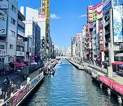 Dōtonbori or Dōtombori (道頓堀; pronounced [doːtomboɾi]) is a district in Osaka, Japan. Known as one of Osaka's principal tourist and nightlife areas, the area runs along the Dōtonbori canal from Dōtonboribashi Bridge to Nipponbashi Bridge in the Namba district of the city's Chūō ward. Historically a theater district, it is now a popular nightlife and entertainment area characterized by its eccentric atmosphere and large illuminated signboards.