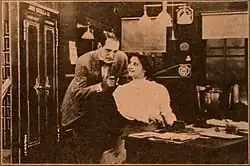 The writer of the scenario was Lloyd Lonergan, who was an experienced newspaperman employed by The New York Evening World while he was writing scripts for the Thanhouser productions.[2] The film director is unknown, but it may have been Barry O'Neil. Film historian Q. David Bowers does not attribute a cameraman for this production, but at least two possible candidates exist. Blair Smith was the first cameraman of the Thanhouser company, but he was soon joined by Carl Louis Gregory who had years of experience as a still and motion picture photographer. The role of the cameraman was uncredited in 1910 productions.[3] The only one credit is known and that is Anna Rosemond as May Wilson. The rest of the credits are unknown and like other productions are fragmentary.[4] In late 1910, the Thanhouser company released a list of the important personalities in their films. The list includes G.W. Abbe, Justus D. Barnes, Frank H. Crane, Irene Crane, Marie Eline, Violet Heming, Martin J. Faust, Thomas Fortune, George Middleton, Grace Moore, John W. Noble, Anna Rosemond, Mrs. George Walters.[5] A surviving film still gives the possibility of identifying one other actor.[6]