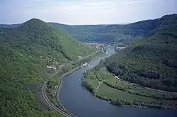 ![]() The Doubs upstream of Besançon, amid richly-forested high hills | |