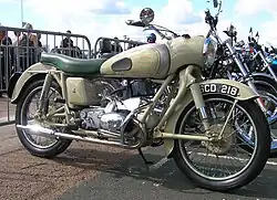 After World War II Douglas was in financial difficulty and reduced its output to the 350 cc flat-twin engine models with the engine mounted across the frame.[3] The flat twin had been the Douglas trademark since 1906 and had a long history of Isle of Man TT racing successes.[4]