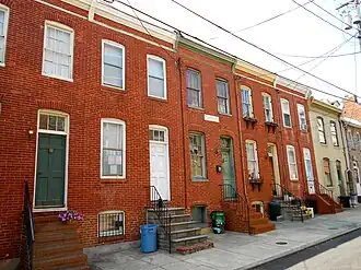 Douglass Place is a group of historic rowhouses located at Baltimore, Maryland, United States. Built in 1892, it represents typical "alley houses" of the period in Baltimore, two narrow bays wide, two stories high over a cellar, with shed roofs pitched to the rear. Italianate influence is reflected in their segmental-arched window and door openings, and in the simple molded sheet metal cornices which crown the buildings. Frederick Douglass (1818-1895) constructed the five buildings as rental housing for blacks in the Fells Point area of Baltimore, where he had resided from the 1820s to 1838. The site was the location of the Dallas Street Station Methodist Episcopal Church, which he had attended while living in the area.[2]