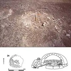 The remains of a Roman fort were excavated by Headland Archaeology.[10][3] Three ditches and the base of a rampart were investigated comprising part of the defence works.[3] Set into the back of the rampart five circular stone bread ovens were located. Running behind the ovens a gravel track was interpreted as the intervallum way (one of the internal roads of the fort). The foundations of a building that it is thought served as the fort’s hospital were also uncovered and an iron-smelting shaft furnace, a first for Roman Scotland. Fragments of samian ware and amphorae were recovered dating to the Flavian period and the first Roman incursion into Scotland (from 79 AD to the mid-80s AD).[3] The remains of the Roman fort are a scheduled monument.[11]