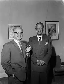 Sir Dove-Myer Robinson (15 June 1901 – 14 August 1989) was Mayor of Auckland City from 1959 to 1965 and from 1968 to 1980. Holding office for 6,543 days in total (17 years, 10 months, and 30 days), his was the longest tenure of any holder of the office.[1] He was a colourful character and became affectionately known across New Zealand as "Robbie".[2] He was one of several Jewish mayors of Auckland, although he rejected Judaism as a teenager and became a lifelong atheist.[3] He has been described as a "slight, bespectacled man whose tiny stature was offset by a booming voice and massive ego".[3]