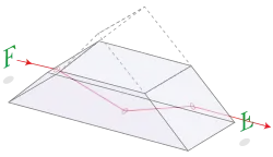 A beam of light travelling parallel to the longitudinal axis, entering one of the sloped faces of the prism, undergoes total internal reflection from the inside of the longest (bottom) face and emerges from the opposite sloped face. Images passing through the prism are flipped (mirrored), and because only one reflection takes place, the image is also inverted but not laterally transposed.