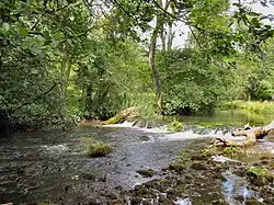 The River Dove is a famous trout stream, 45 miles in length.[14] Charles Cotton's Fishing House, the inspiration for Izaak Walton's The Compleat Angler,[15] stands in the woods by the river. From Hartington to its confluence with the River Manifold at Ilam the River Dove flows through the scenic limestone valley known as Dove Valley,[16] or Dovedale. From Hartington south to Ilam, a distance of eight miles (13 km), the Dove flows through Beresford Dale, Wolfscote Dale, Milldale, and then Dovedale.