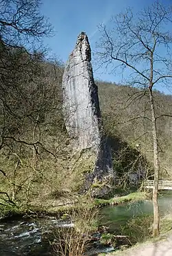 Dovedale's other attractions include rock pillars such as Ilam Rock,[5] Viator's Bridge and the limestone features Lovers' Leap and Reynard's Cave.[6]