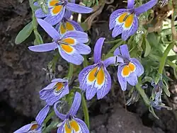 Downingia bacigalupii is a species of flowering plant in the bellflower family (Campanulaceae) known by the common name Bach's calicoflower[1] or Bacigalupi's downingia.[2] This showy wildflower is native to the western United States from California to Idaho, where it is a resident of moist meadows and vernal pool ecosystems. This annual grows on a branching erect stem with small diamond-shaped leaves at intervals. At the top of each stem branch is one or more flowers, each between one and two centimeters wide. The flower has two long upper lobes which may be flat and straight or curl back, and are usually dark-veined blue. The three lower lobes are fused into one three-toothed surface, which is dark-veined blue with two bright yellow blotches rimmed with white in the center. The fruit is a dehiscent capsule two to five centimeters long. The stamens are fused together into an erect purple stalk bearing the dark anthers.