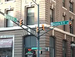 The history of downtown began in 1826 with Wilson Lumpkin and Hamilton Fulton surveying a possible canal route between Chattanooga, Tennessee, and Milledgeville, Georgia's capital at the time.[2][3] In 1833, Lumpkin, who had become governor, requested that the state legislature charter three railroad lines. By 1836, the state-financed Western and Atlantic Railroad, linking the middle of Georgia to the other states north and west, was granted a charter by the legislature, which was signed into law by Lumpkin. As a result, the town named Terminus was founded in 1837, named for the end of the railroad line.[4] Terminus received a name change in 1842 when the town's 30 inhabitants voted to change the town's name to Marthasville, in honor of Governor Lumpkin's daughter.[5]