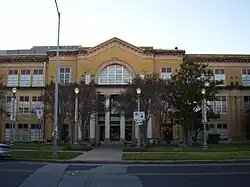The city hall is located in Downtown Austin and is the administrative office of Austin. Originally built in 1871, the city hall was demolished and rebuilt multiple times before the current one was built in November 2004.[21][22] The current city hall cost $55.6 million to build and contains a total of seven stories, of which three are underground.[23] Within the building, city council meetings take place in the council chambers.[24] The city council, including the mayor, are voted by Austin's residents. In 2014, Austin changed its at-large system of electing city council members to a 10–1 district-based system. The mayor serves a four-year term.