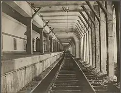 The Washington Street Tunnel carrying the Main Line Elevated (later the Orange Line) opened on November 30, 1908.[12] Stations on the tunnel were built in pairs with different names and separate entrances, an appeasement to merchants on the street who desired maximal pedestrian traffic. Stations were located at Summer northbound with entrances at Summer Street and Franklin Street, and Winter southbound with entrances at Winter Street and Temple Place. The Dorchester extension of the Cambridge Tunnel (now the Red Line) was built one level below the Washington Street Tunnel. Washington station opened on April 4, 1915, with additional entrances on Summer Street at Hawley Street and Chauncey Street.[12]