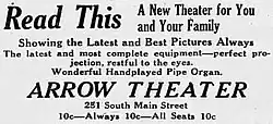 The first theater on the site of the current Downtown Independent opened in 1924 as the Arrow Theater.[3] The original owner, George Carpenter, had commissioned John E. Kunst to design a picture theater. The building included a pipe organ, two stores and auditorium seating for 500.[4]