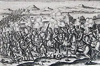 The Drabants quartered at Krasna Luka when Charles launched a costly assault on Veprik, on 18 January 1709.[168] During the night of 11–12 May, the king laid siege to Poltava.[169] On 18 May, the Russians attempted to force Charles to end the siege by attacking Opishnia. The Drabants fought alongside the king and forced the Russians back over the Vorskla, losing 200 killed to 150–200 Swedes.[170] On 26 June, the Russians again crossed the river and prepared an ambush. Smaller skirmishes were initially fought against the Cossacks of Ivan Mazepa (allied to Charles since late 1708). When the Drabants arrived they compelled the Russians to retreat without a fight.[171]