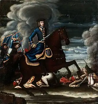 On 6 September, the corps participated in the Storming of Lemberg (Lviv) in which Drabant Jöran Silfverhielm personally captured the garrison commander, Franciszek Gałecki, hiding in a Jesuit monastery.[117][118] The Drabants then witnessed the Polish surprise attack on the Swedish camp outside the town. When the king received news of Arvid Horn's surrender at Warsaw,[m][120] he marched back to expel the Saxons from Poland. When the Swedish army crossed the Vistula by the end of October, the enemies fled Warsaw. Many were captured in the pursuit.[121] At one occasion, three Drabants disarmed and captured 21 Russians and Saxons.[122] The Drabants, unable to catch up with the king, instead marched with Otto Vellingk's army. On 1 November, they encountered 300 cavalries in a rearguard, killing most of them while capturing a major and 60 soldiers.[123] Vellingk, along with his five regiments (including the Drabants), arrived at Poniec the day after the battle and then marched to Tillendorf.[124][125] There, on 8 November, they intercepted 600–700 Russians in a wagon fort; the Russian force was annihilated after a brave defence—five were captured and the rest killed,[126] against 21 killed and 50 wounded Swedes. By the end of the month, Charles and the Drabants went into cantonment around Rawicz.[127]