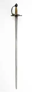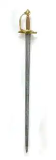 From 1700 to 1703, the Drabants used a 112 cm sword of model 1693 (m/1693), with a 95 cm long double-edged straight blade, with blood grooves; the width of the blade was 3,7 cm at the hilt, and 2,4 cm half a meter out from the hilt. The common-Drabants had hilts made of polished blue tempered wrought iron, with the grip wrapped in gilded brass wire; the ranks above them presumably had gilded brass hilts and wire.[49]