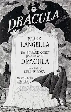 In 1973, the producer John Wulp staged the play with the Nantucket Stage Company in Nantucket, Massachusetts. He asked Edward Gorey, an illustrator known for his macabre, surrealist imagery, to design the sets and costumes. Gorey, who had never worked in theatre before, created a mostly black-and-white design accented with red. Dennis Rosa directed and Lloyd Battista starred as Dracula. Wulp subsequently moved the production to the off-Broadway Cherry Lane Theatre in New York.[17] In 1976, the producer Eugene Wolsk decided to revive Dracula on Broadway, using the Gorey designs. He worked with Wulp and several co-producers, including Jujamcyn Theaters, to stage the revival.[18] The revival opened on 20 October 1977 at Jujamcyn's Martin Beck Theatre, with Rosa directing. It closed on 6 January 1980 after 925 performances.[19]