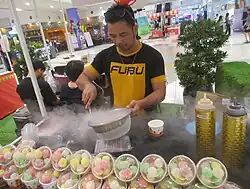 Filipino vendor mixes cereal balls with liquid nitrogen