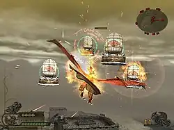 In aerial combat missions, players control Caim's dragon partner Angelus. During these moments, players are directed against multiple aerial targets that must be destroyed in order to win. As Angelus gains experience points through combat, she levels up and is able to do more damage – similar to the weapons used in ground-based combat. Boss battles are all located in these aerial stages.[4] Angelus has access to two types of standard fire attacks: a free-aim blast that causes high damage, and homing bolts that can hit multiple targets but do less damage. Homing shots can be dodged or countered by some enemy types later in the game.[5] Angelus can also perform a special area-affecting magical attack that damages or kills multiple enemy units. She can be used to quickly traverse battle areas during primarily ground-based missions.[1] Players can summon Angelus during certain ground-based missions and play her in Strafe Mode. Controls are identical to ground-based combat. Pressing the select button causes Caim to dismount Angelus.[2] Caim and Angelus level up during combat in different ways: as Caim levels up, their shared health meter grows, while Angelus' leveling increases the damage her attacks do to enemy units.[5]